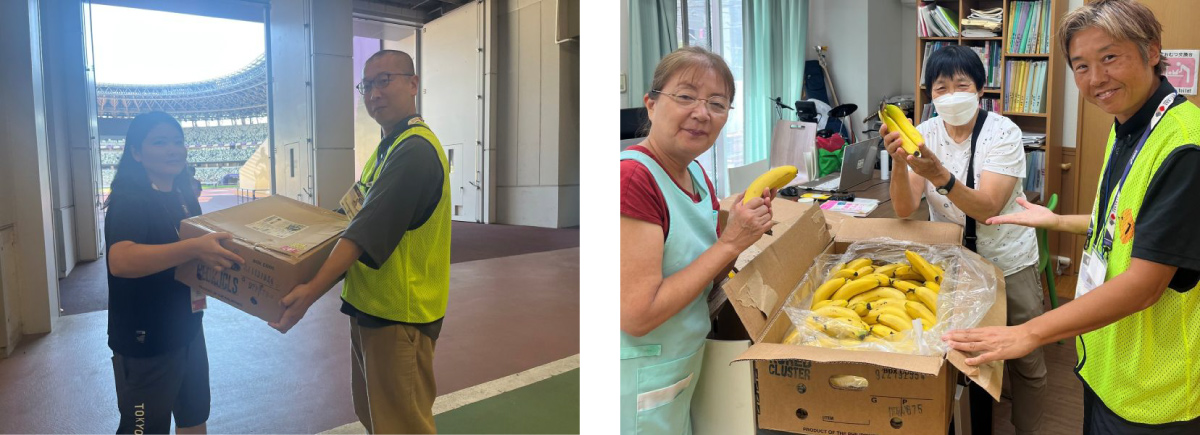 競技・練習会場である国立競技場や都内各練習会場等で選手・スタッフ用に提供された、まだおいしく食べられるバナナを、本協議会は大会期間を含む約2週間、大田区を中心に活動する特定非営利活動法人(以下、NPO法人)フードバンク大田の協力を得て、各会場におけるバナナの回収から活用までのマッチング・配送を実施しました。都内の社会福祉協議会・フードバンク・子ども食堂をはじめとする子ども支援・福祉団体約40団体において約3900本(重量約730kg)のバナナが活用されました。
